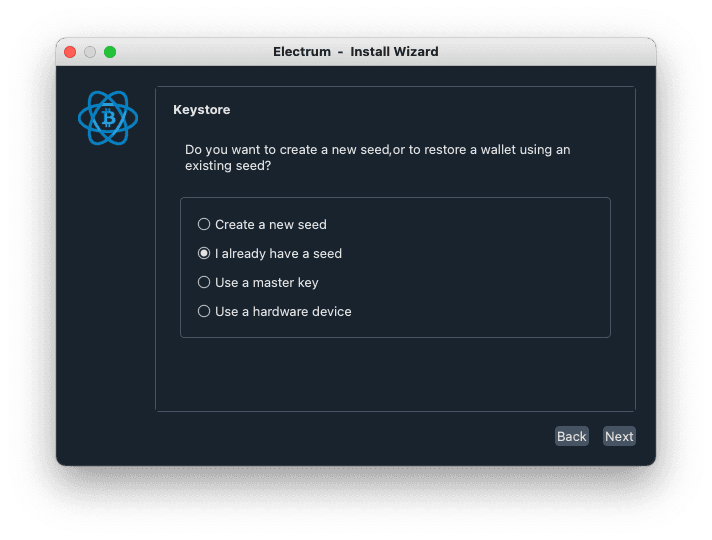 3. Choose “I Already Have a Seed” and Enter Your Electrum Wallet Seed