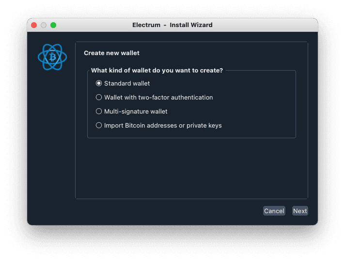 When you start the Electrum client, the first question you’ll need to answer is which type of wallet you want to create. In addition to the “Standard Wallet,” you could opt for a “Multi-Signature Wallet” or a “Wallet with Two-Factor Authentication” for extra security. You could also import a Bitcoin address or private keys on versions of Electrum 3.0 and above.