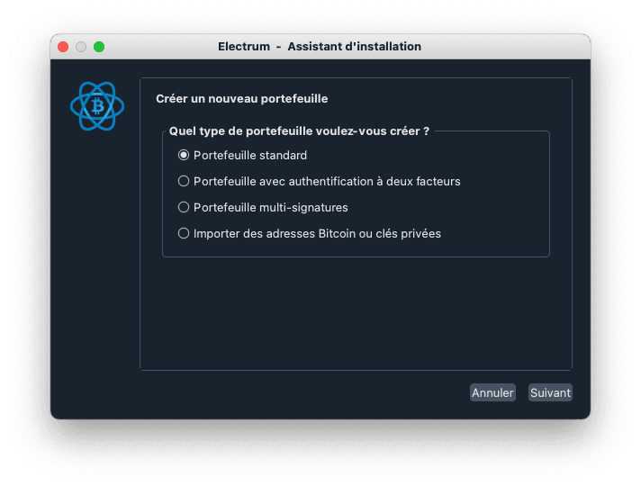 Lorsque vous démarrez le client Electrum, la première question à laquelle vous devrez répondre est le type de wallet que vous souhaitez créer. En plus du « Portefeuille standard », vous pouvez opter pour un « Portefeuille multi-signatures » ou un « Portefeuille avec authentification à deux facteurs » pour plus de sécurité. Vous pouvez également importer une adresse Bitcoin ou des clés privées sur les versions d’Electrum 3.0 et ultérieures.